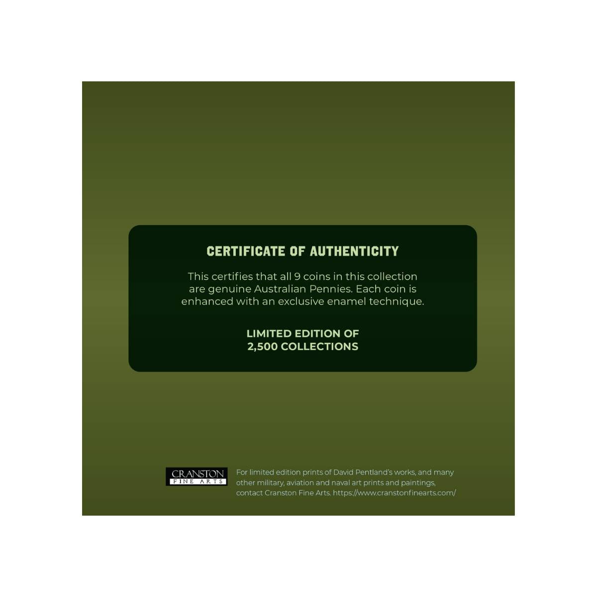 Each of the 9 Australian Pennies features an illustration of a WWII tank meticulously researched by artist David Pentland, rendered in exquisite detail, and further enhanced with an exclusive enameling technique! The breathtaking full-colour reverse is a worthy tribute to these behemoths of the land & the men who crewed them.