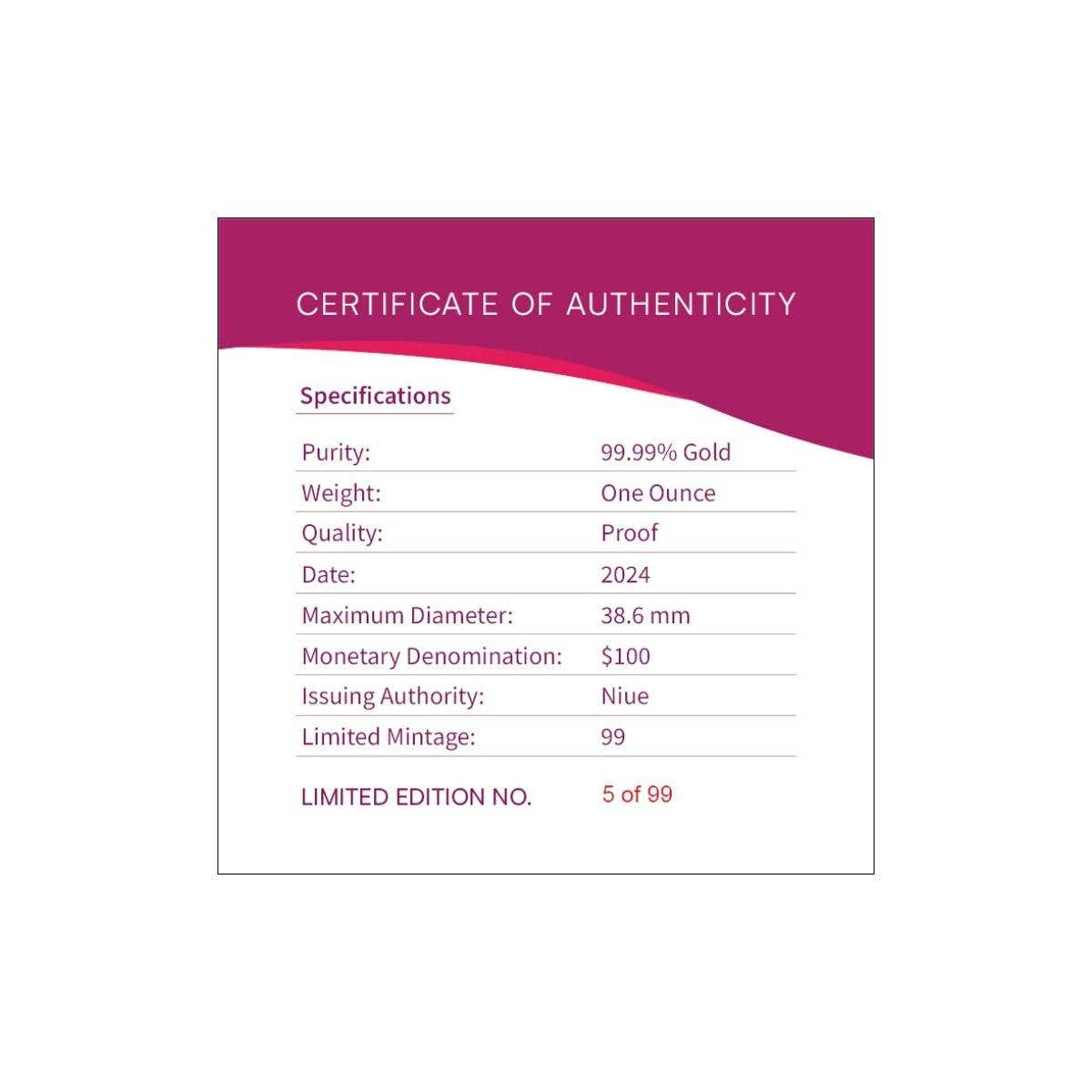 The blue and pink shades of the fins of two Siamese fighting fish ripple and swirl across 1oz of pure 99.99% gold, creating a wonderful sense of movement and iridescent shimmer. Extremely exclusive, mintage has been strictly limited to only 99 coins worldwide. Underpinned by a numbered Certificate of Authenticity, this is one of the stand-out coins of 2024. Don’t let it go without a fight – buy now!