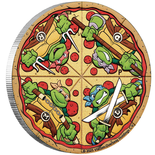 The perfect way to celebrate the world’s greatest band of crime-fighting, pizza-loving brothers, we are delighted to present the officially licensed Teenage Mutant Ninja Turtles 2025 $2 Pizza Colour 2oz Silver Uncirculated Coin!