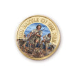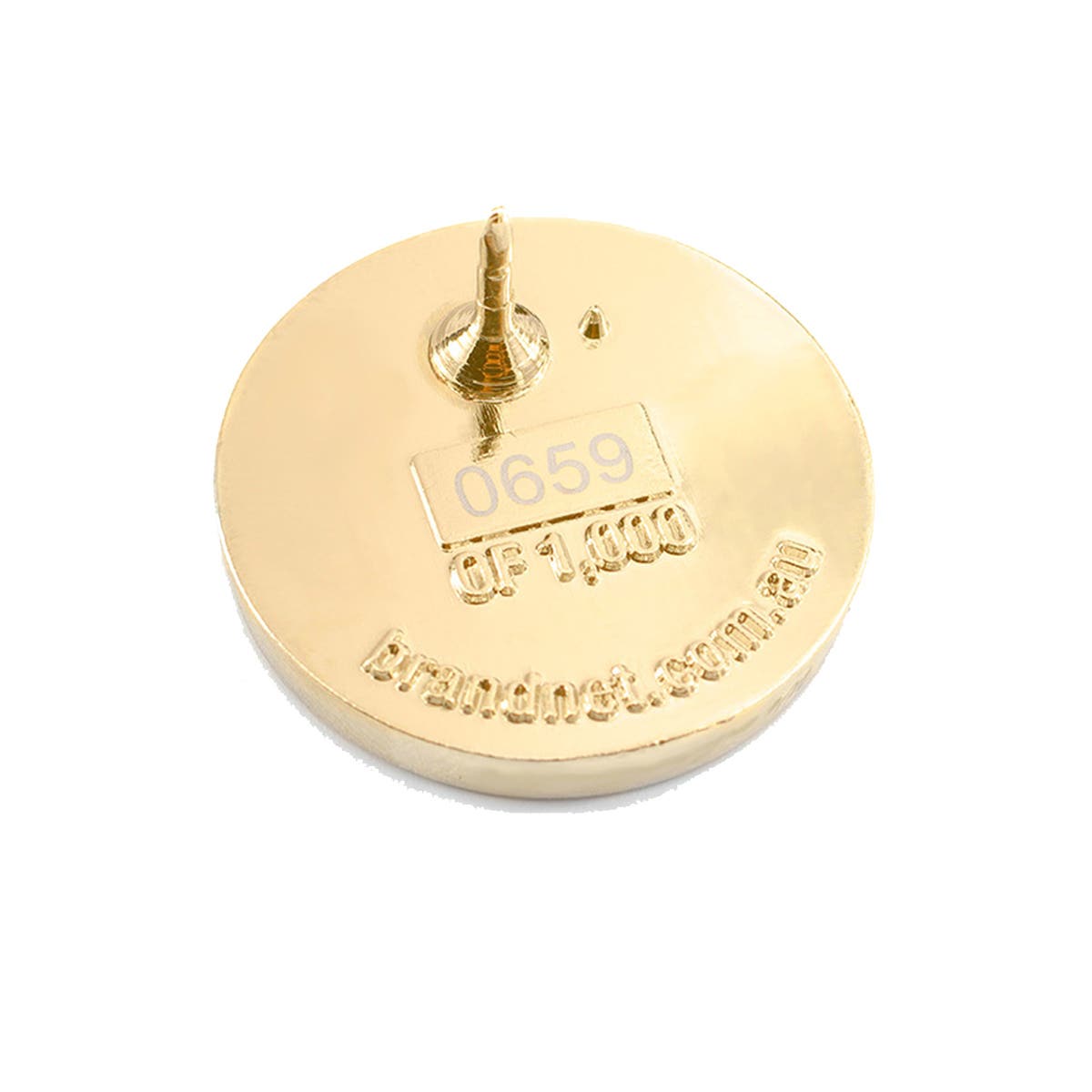 Crafted from die struck brass, sandblasted gold background, and a full colour printed overlay