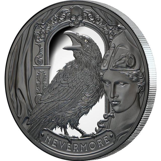 A haunting piece of numismatic art, capturing the essence of one of the great works of Gothic horror literature, we are delighted to present The Raven 2025 $5 2oz Silver Black Proof!