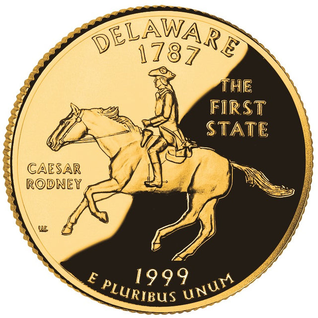 The Delaware coin beautifully depicts Caesar Rodney, an American lawyer and politician from St. Jones Neck, Delaware. Rodney was an officer of the Delaware militia during the French and Indian War and the American Revolution, a signatory of the Declaration of Independence, a Continental Congressman, and President of Delaware during most of the American Revolution.