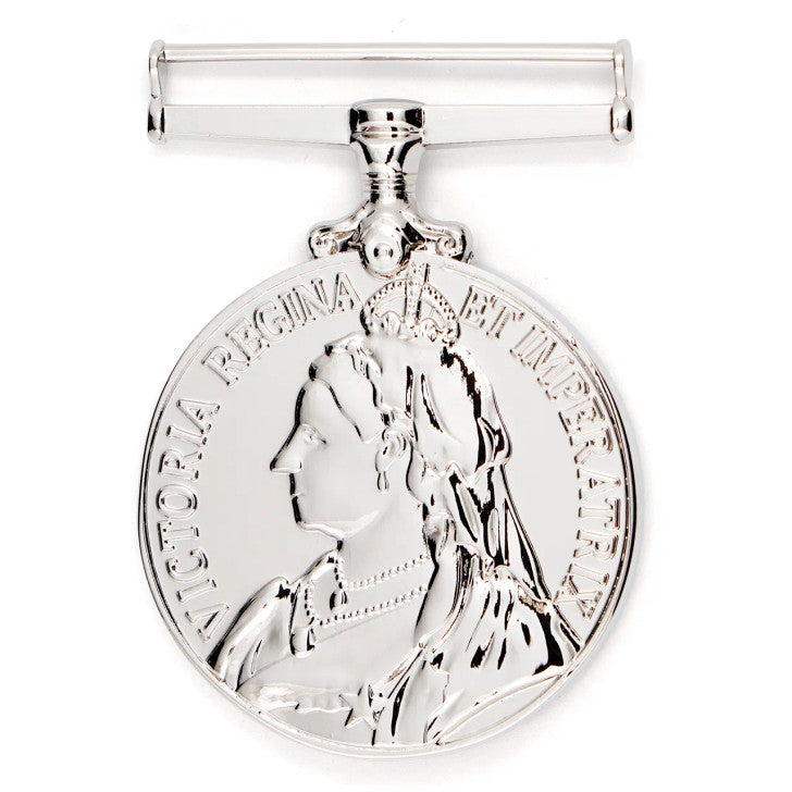 Obverse: Bears the crowned and veiled portrait of Queen Victoria Reverse: Britannia carrying a flag, and holding a laurel wreath out to advancing soldiers Designer: G.W. de Saulles Dimensions: 38mm in diameter Ribbon: Broad orange central stripe flanked by two dark blue stripes and two red stripes